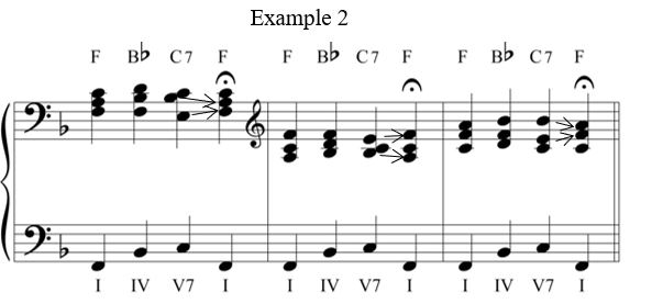 As I’ve said a number of times in my tutorial, “We need to organize the sounds that have been floating around in our ears, fingers, and voices since the day we started making music.” Learning to hear and use the basic chords [I, IV, and V(7)] is an important first step in understanding chords. They can be played as a common tone progressions, beginning with different positions of the tonic [I] chord: